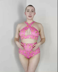 - Criss cross front create a halter style neckline and a sexy peekaboo opening.